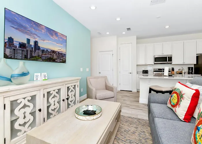 Het is gelegen in Celebration wijk van Orlando, op rijafstand van 36 minuten van de luchthaven Orlando Internationaal. Bars en restaurants zijn enkele meters verderop. Reunion Resort Water Park is net dichtbij de villa.